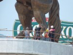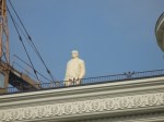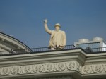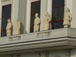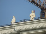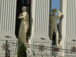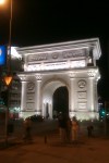 One of the striking features of the project is the speed. I have witnessed few building projects pursued with such determination and speed. This is a government in a hurry: no doubt elections play a role. The quicker the project is completed, the more it presents itself as a fait accompli any subsequent government will have a hard time to reverse. In addition, there is something else at work. When building modern architecture, the process of building is an acceptable part of the process. In fact, often the building process itself is a source of reflecting on modernity, materials, techniques, etc. However, this process is about suggesting that the new cityscape is actually not new. There is something nearly shameful about the building process. The Porta Makedonija—Skopje’s arc de triomphe was a large concrete cube during its construction, in need to be covered up as quickly as possible (I was told that for the anniversary of Macedonian independence a few years back, the top portion was not yet covered so the arc was provisionally covered with a printed version of the stone ornaments). Once complete, the effect is to seem like the new is the old, and the older socialist modern architecture is the new, intruding the in the space.