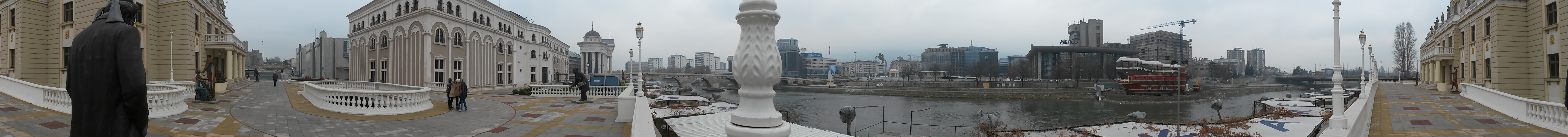 The project is also mostly about the façade. The buildings on the northern bank of the Vardar are grotesquely narrow. The large façade has just as much building behind it to not seem like only a façade. However, reports suggest that the internal spaces are dysfunctional, with balconies not accessible, office spaces inadequate for use. However, criticizing the buildings for this is to misunderstand their purpose. If their goal is to cover up what is behind them, the internal function is just a tool to justify the façade, not a purpose itself. In this sense, the façades fulfill their intended goal. They hide the Čaršija the old center of Skopje, making it invisible from the new center, they block the view of the minarets and they hide the modern architecture of the opera or are given as a make-over to the government complex and other socialist era buildings.